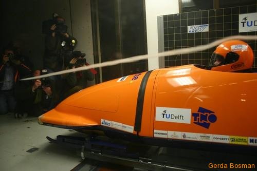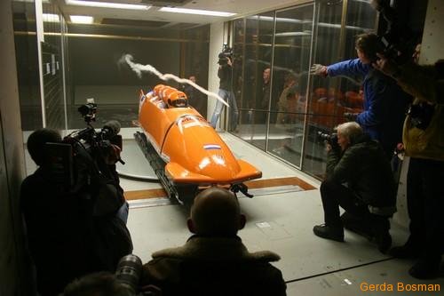 De luchtweerstand die een bobslee tegenkomt tijdens de afdaling kan honderdsten van seconden uitmaken op de eindtijd. Vandaar dat in een grote windtunnel in Marknesse de aërodynamica van het Nederlandse bobsleeteam is getest. Enkele foto’s waren eerder te zien op noorderlicht.vpro.nl